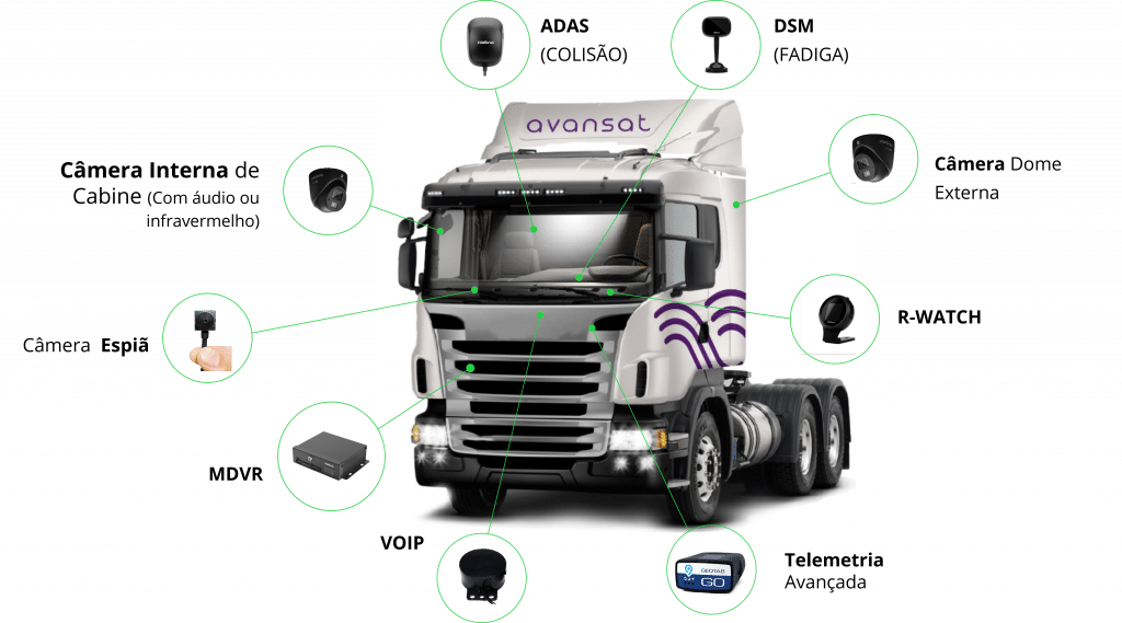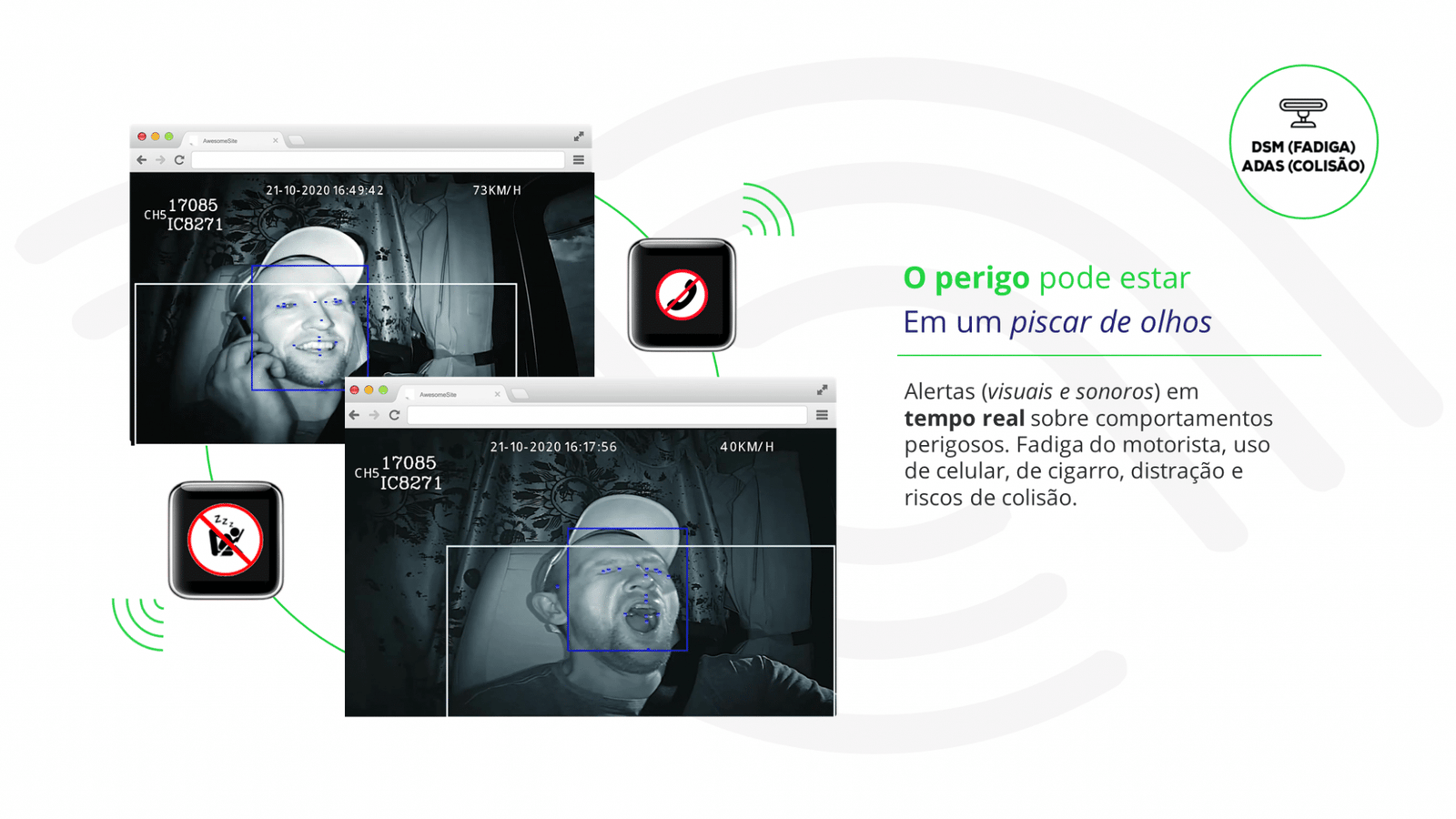 Emite alertas (visuais e sonoros) em tempo real sobre comportamentos perigosos, como: fadiga do motorista, uso de celular ou de cigarro, distração e colisão.